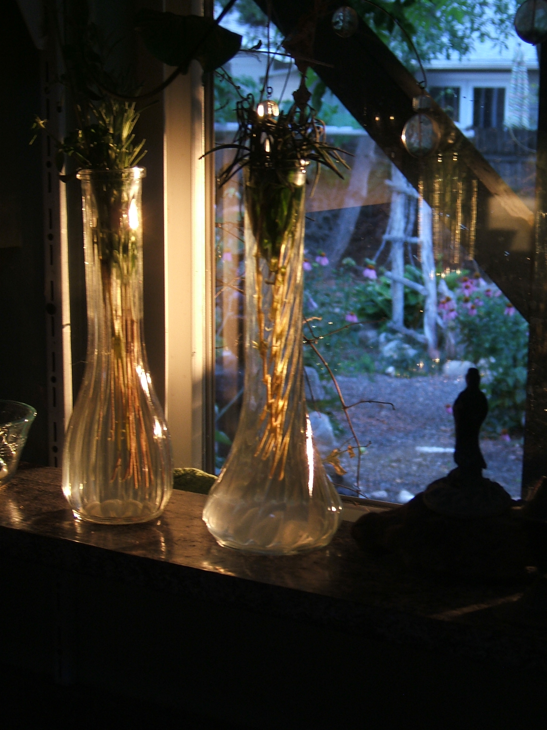 Something happened yesterday around sunset that I hadn’t seen before. For about one minute:thirty-five, the last rays of the sun peeked out from under tumultuous, massed storm clouds and found a sliver of pathway between the branches of three big trees, around the patio roof, and through a major tangle of wisteria to actually make it in our kitchen window. The light was golden, dramatic, and lit up two vases sitting in the window like luminaries. And…in a complete fluke…I had my camera to hand. I took a dozen shots or so and this was at the peak of the light:
