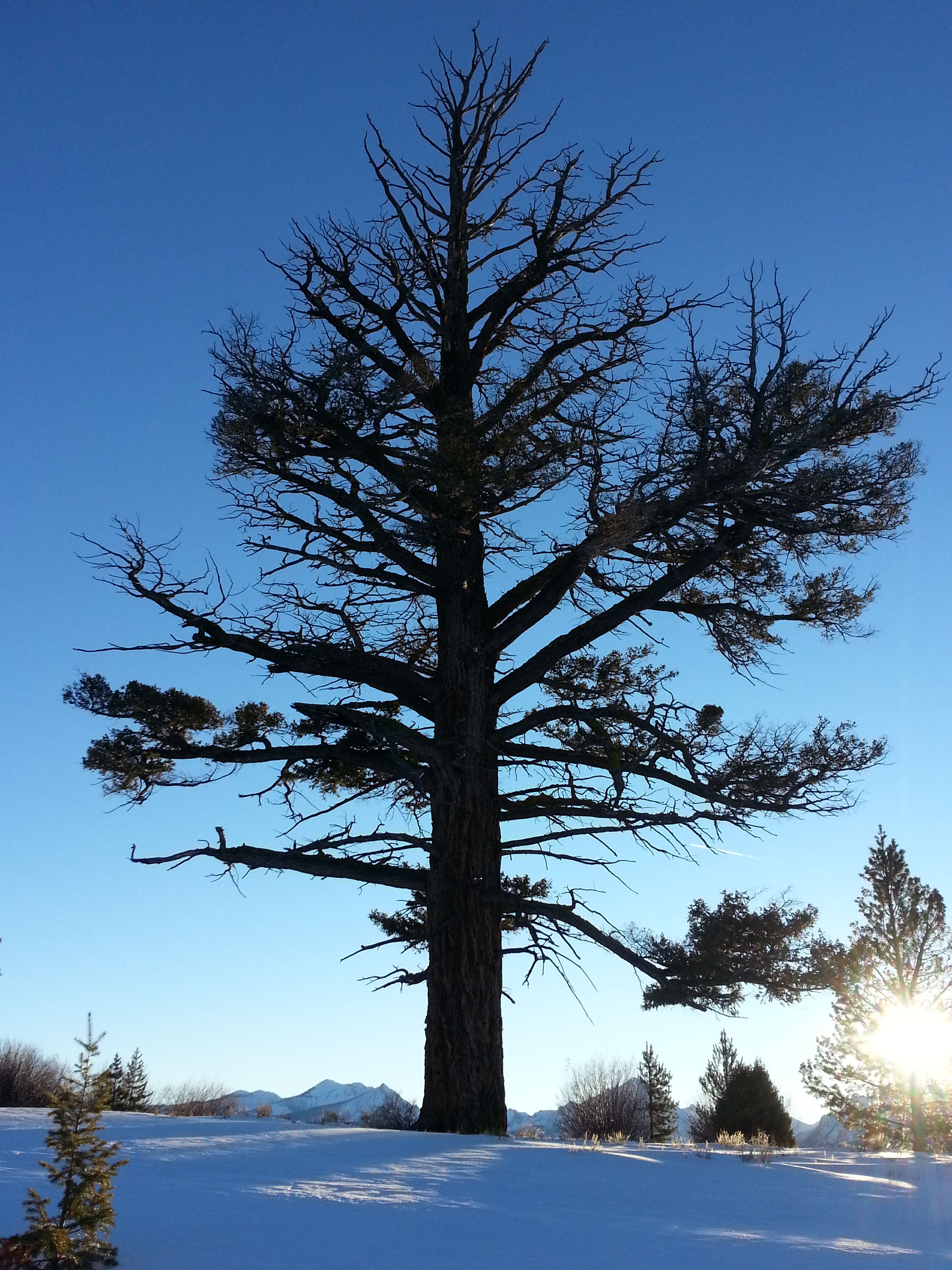 Even more surprising is the fact that, during the rapid years of its pine beetle fueled decline, this giant was apparently not only allowed but encouraged to display that, too, for the entire community. (Note the willow shrubs and young Ponderosa pines posted to stand guard in the foreground…one of the many indicators that this tree was highly regarded in life and remains so in death. Immediately below is a photo of another highly regarded dead tree with posted willow shrub guards. Note the surviving spouse standing alongside in this example.)