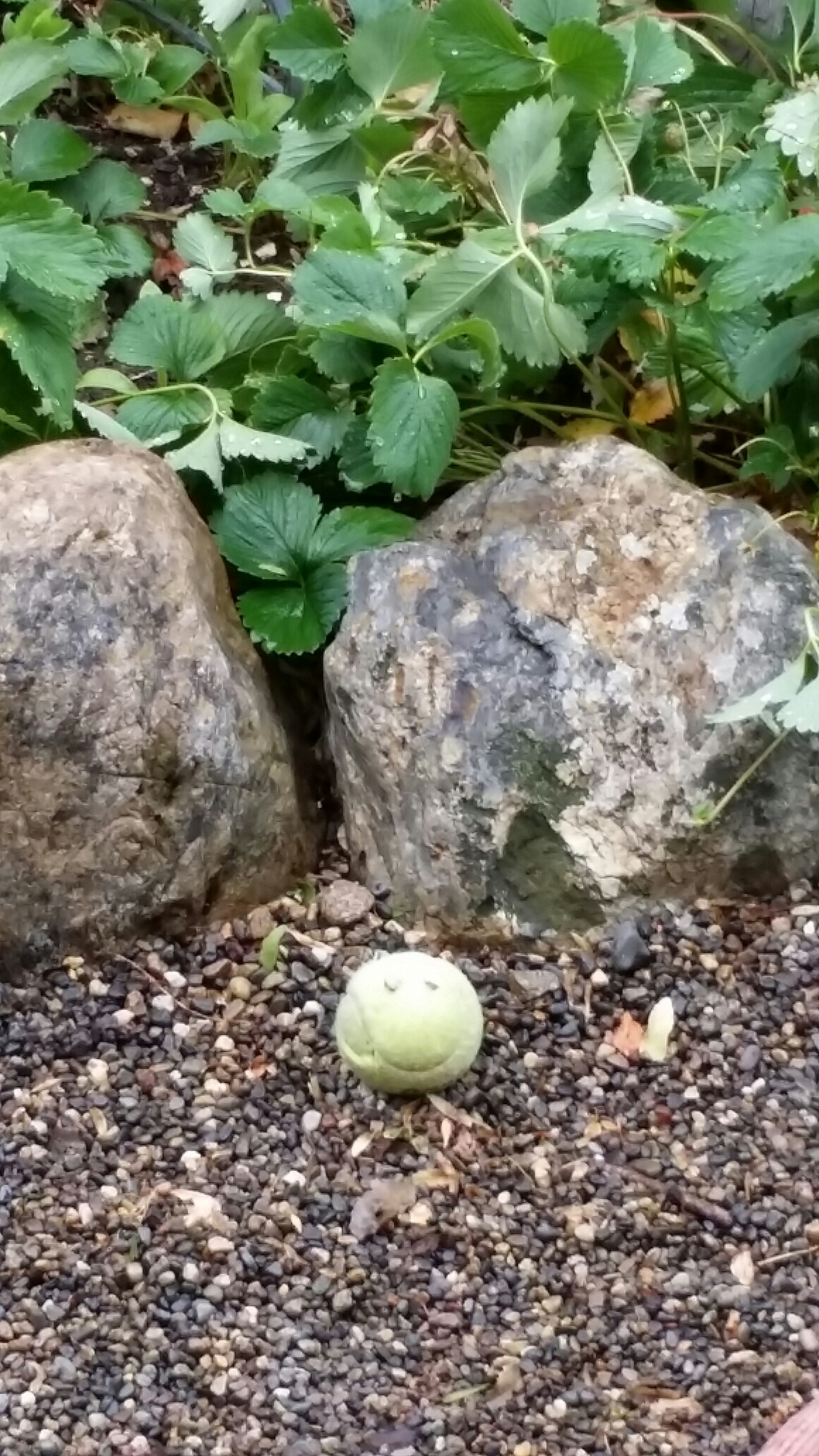 The girls next door lose their tennis balls over the fence all the time, which Dane the mangy rescue mutt then chews into uselessness. This cheerful bit of mastication greeted me this morning when I opened the drapes.