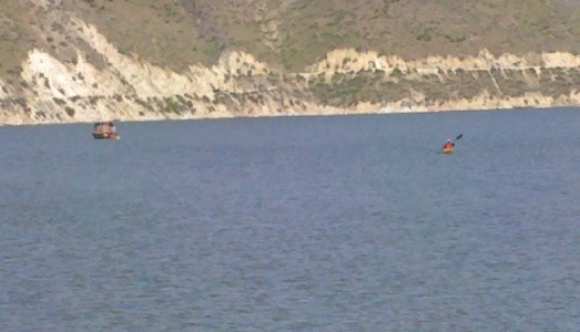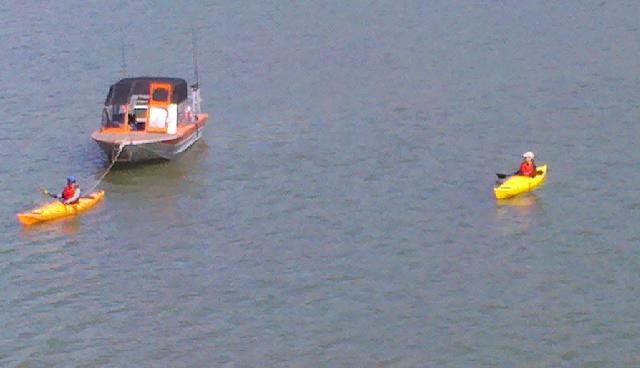 Well, needless to say the fisherman wasn’t turning down an offer like that.  The hubster quickly zipped up his life vest, grabbed his paddle, and launched his kayak again in the direction of the boat.  At first I thought (in resignation) that I’d just wait at the car since my arms had already fallen halfway off my shoulders from the earlier four hours of paddling.  But it didn’t take long (seconds!) for my mind to generate a surprising variety of different capsizing possibilities so the next thing I knew, I, too, was back in the water, paddling furiously after the love of my life, determined to save him from himself if necessary, or at least drown beside him in the ultimate worst case scenario.