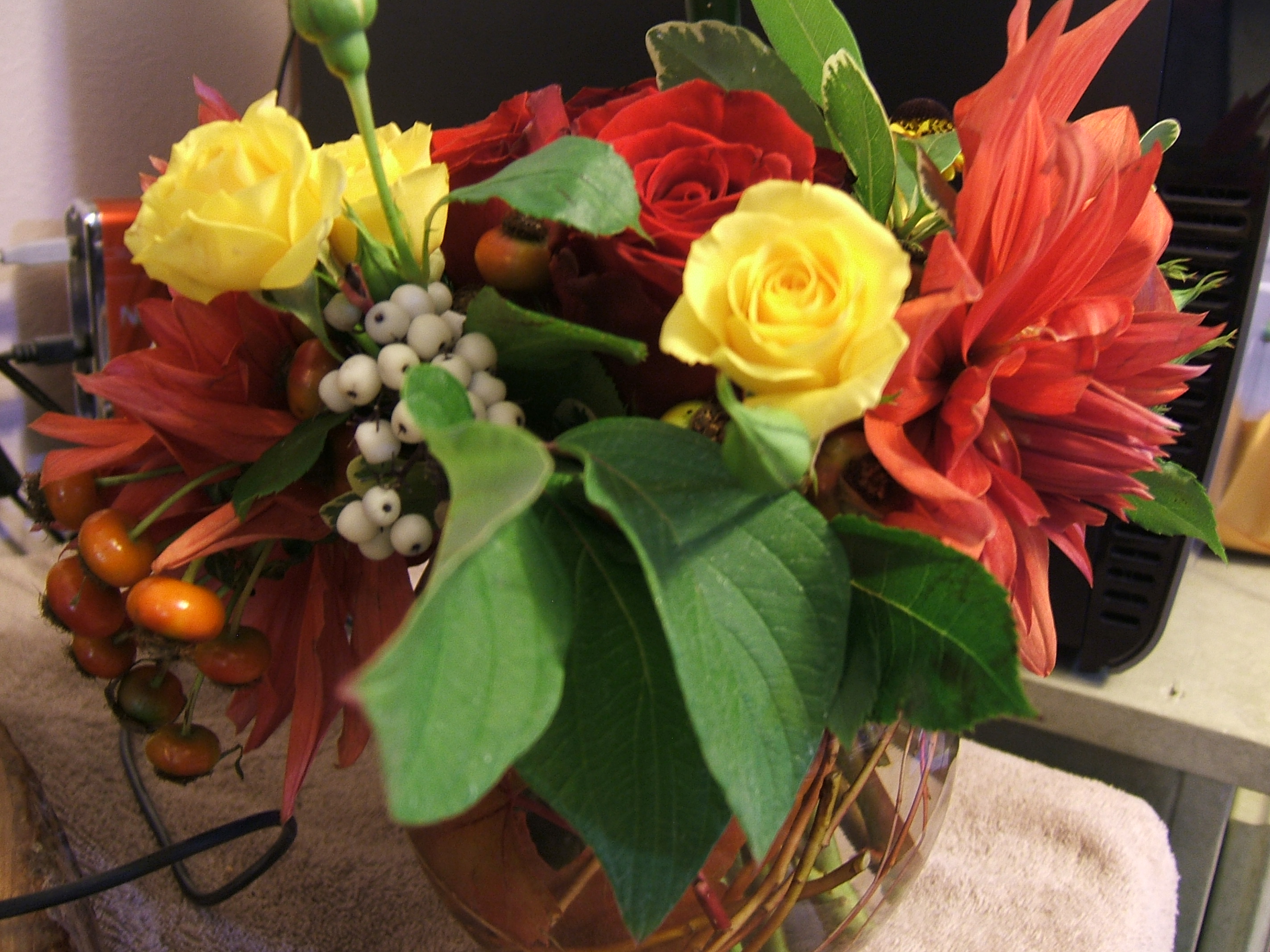 No, these are an anniversary surprise from the hubster, something he arranged to have delivered while he was far, far away in New Jersey on our special day.  The card is actually signed in his handwriting so I know they aren’t just an FTD.com cover-up.  He really pre-remembered and went to all the trouble of setting things up, which makes me feel warm and fuzzy and loved, but then totally awful, too, because I pre-forgot and didn’t arrange anything.  (Which is why I’m now writing this blog post.)
